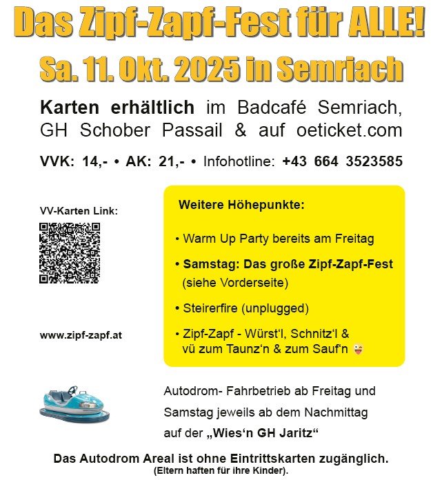 Vorankündigung: Das legendäre Zipf-Zapf-Fest am 10.Okt.2026 in der Bierfesthalle in 8102 Semriach: 🕺💃🍻